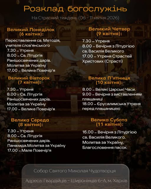 Розклад богослужінь у катедральному соборі святого Миколая Чудотворця на Страсний і Світлий тижні